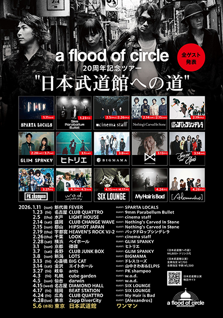 a flood of circleが2026年5月の日本武道館単独公演までの対バンツアー『20周年記念ツアー日本武道館への道』のゲストに、GLIM SPANKY, w.o.d., ドレスコーズ, BIGMAMA, ヒトリエ, My Hair is Badの出演がアナウンスされた。